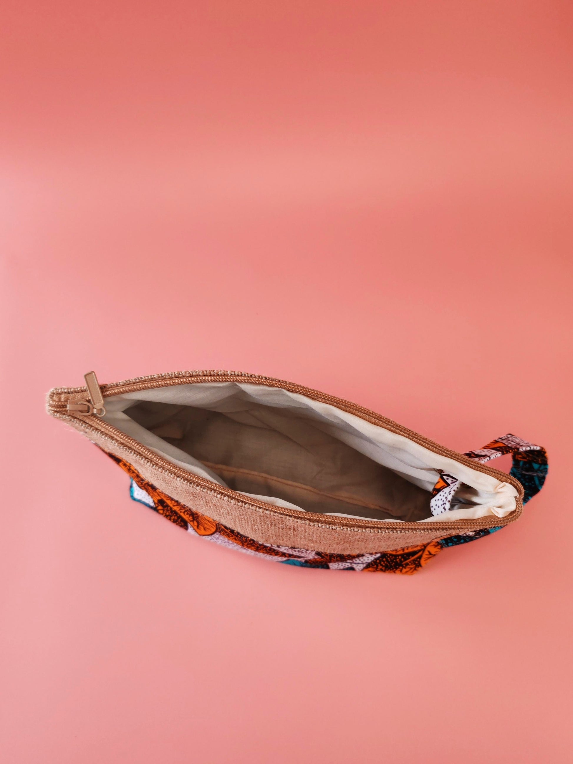 Cette pochette en toile de jute et tissu wax allie authenticité et éclat.